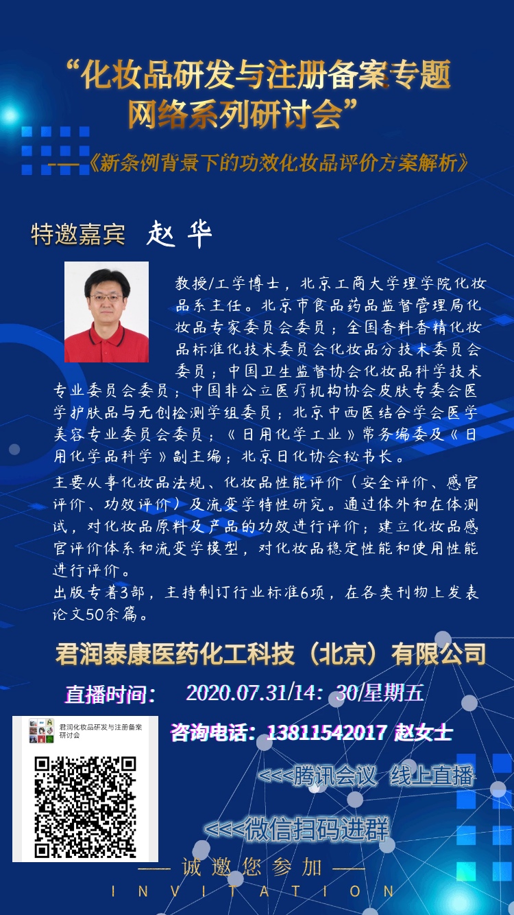 君润科技(北京) “化妆品研发与注册备案专题网络系列研讨会”第二期将于7月31日(周五)14:30分正式开播,我们非常荣幸邀请到北京工商大学理学院化妆品系主任赵华教授为我们带来《新条例背景下的功效化妆品评价方案解析》的主题讲座以及我司注册部经理赵琪女士的《新旧条例比对学习分享》,期待各位届时莅临直播间,共同学习,互相启发!